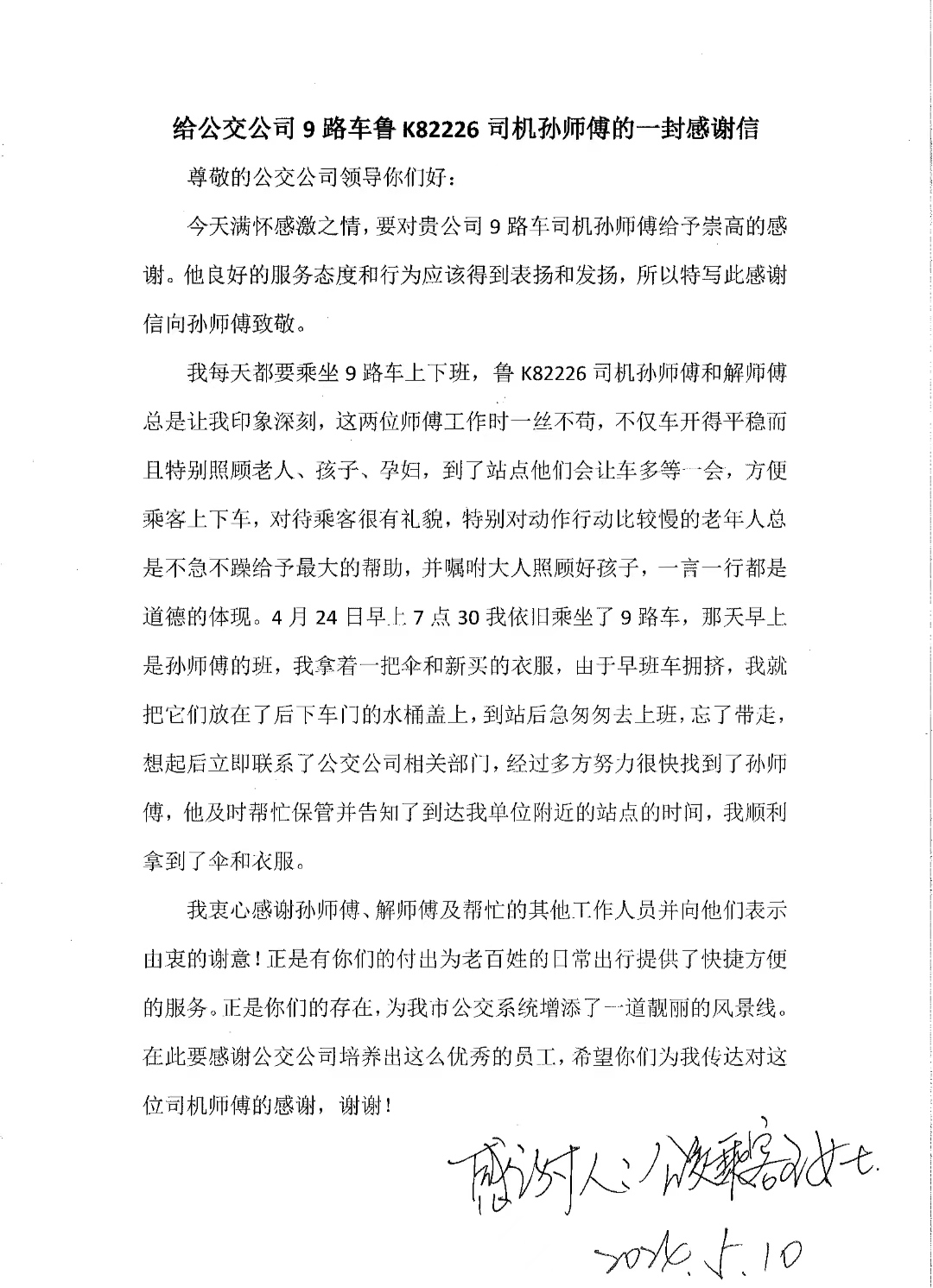 “今天滿懷感激之情,要對貴公司9路車司機(jī)孫師傅給予崇高的感謝。”5月10日,威海公交集團(tuán)四分公司收到一封來自王女士的感謝信,對9路車駕駛員孫世波的拾金不昧表示感謝,并對其所在車組日常服務(wù)給予高度評價。