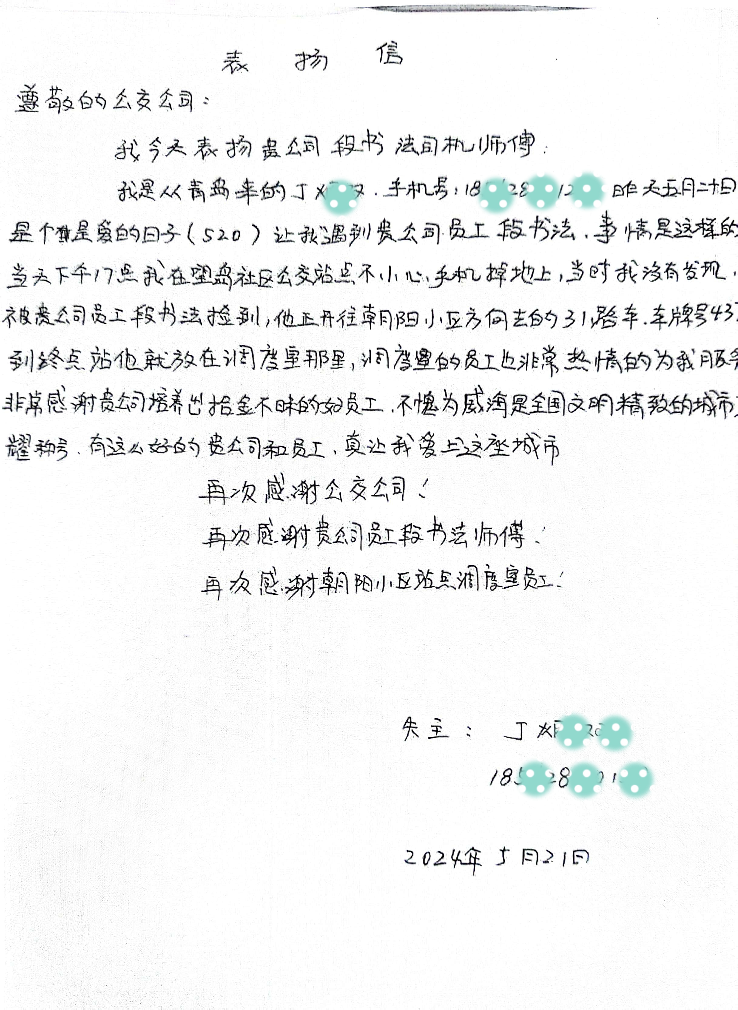 上一封感謝信還帶有余溫,四分公司又收到了一封手寫表揚(yáng)信,表揚(yáng)31路線駕駛員段書法履職盡責(zé)、拾金不昧,點贊朝陽小區(qū)站務(wù)員徐琳服務(wù)熱情、真誠待人。
